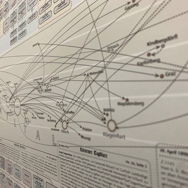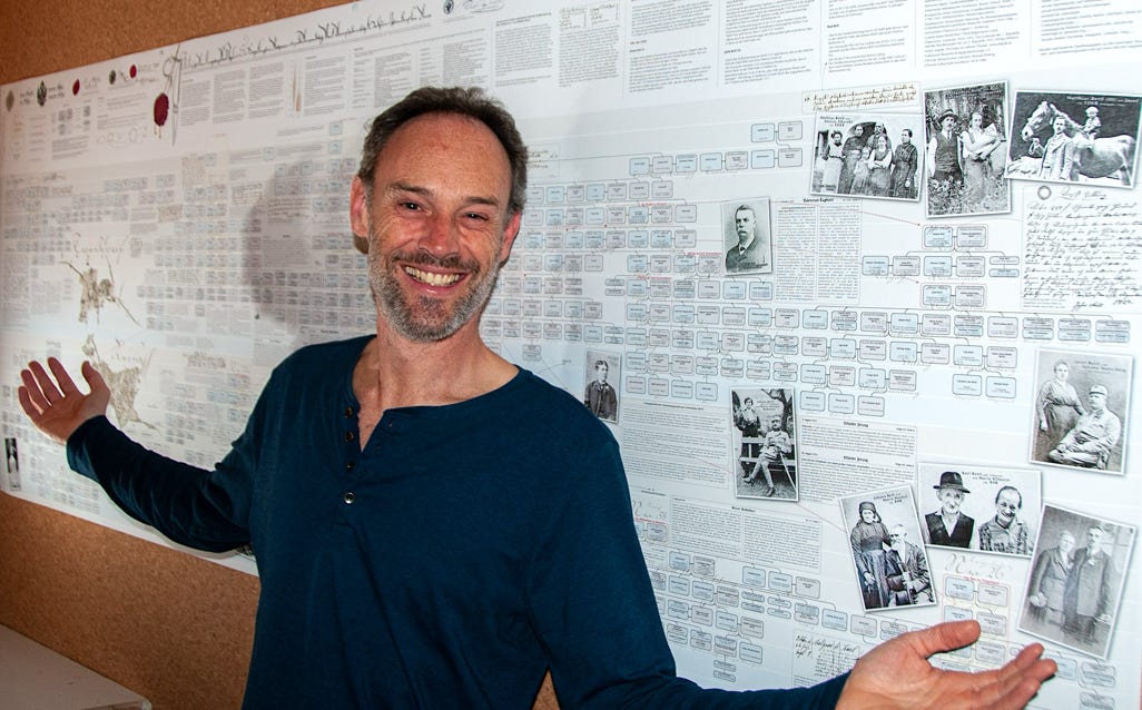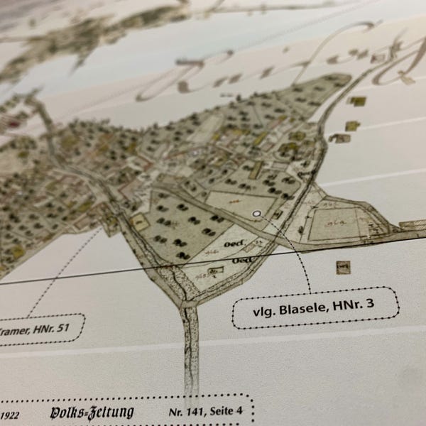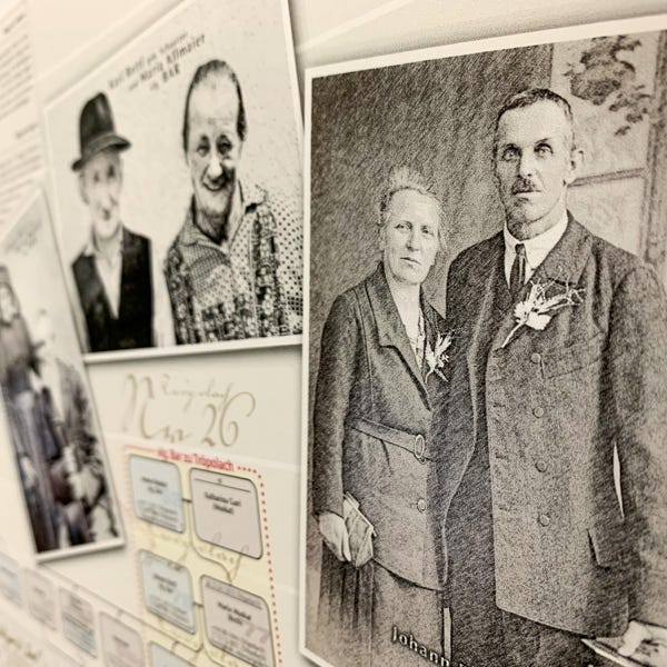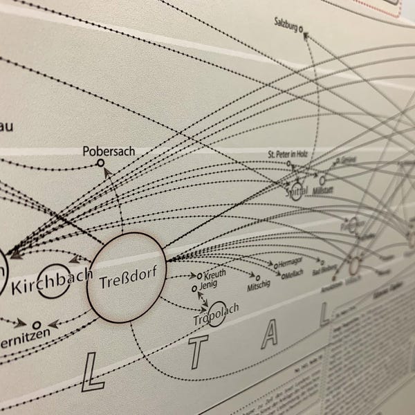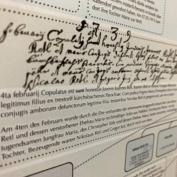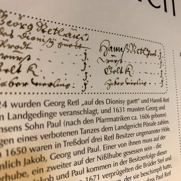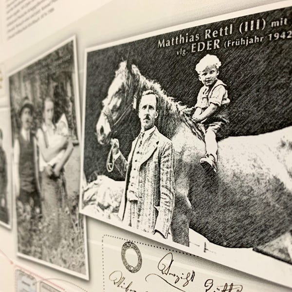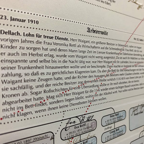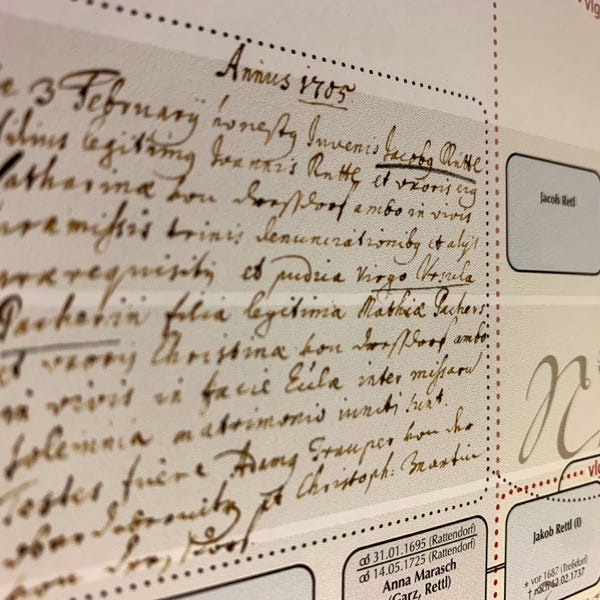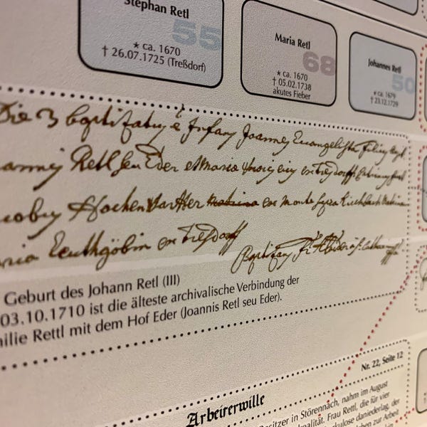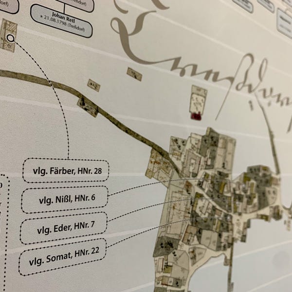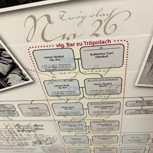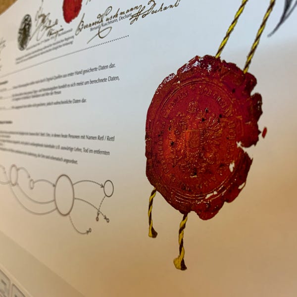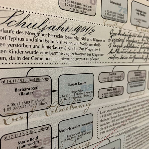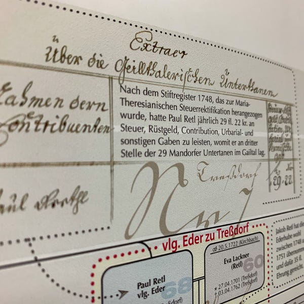 So ideal eine Datenbank zum Archivieren und Nachschlagen auch sein mag, eine große Zahl an gesammelten Daten anschaulich zu präsentieren vermag sie nicht. Daher wurde der Versuch gewagt, die Ergebnisse der genealogischen Forschungsarbeit grafisch und optisch ansprechend aufzubereiten. Mit den Maßen von 100 cm x 250 cm entstand sprichwörtlich (m)ein „Opus magnum“, die Familientafel mit den Familien Retl/Rettl aus Treßdorf und deren Verbreitung.
